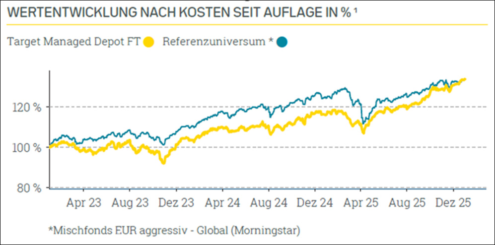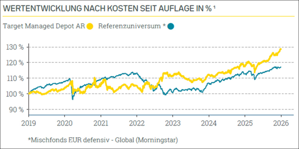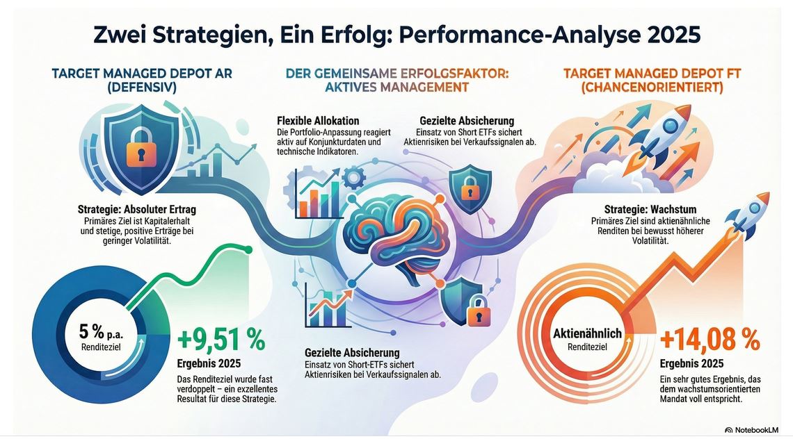 Zusammenfassend lässt sich festhalten, dass beide Strategien, Target Managed Depot AR und Target Managed Depot FT, ihre jeweiligen Ziele für das Berichtsjahr 2025 erfolgreich umgesetzt und teils deutlich übertroffen haben. Die defensive AR-Strategie überzeugte mit einer exzellenten Rendite, während die wachstumsorientierte FT-Strategie sein Mandat zur Erzielung aktienähnlicher Erträge voll erfüllte.
