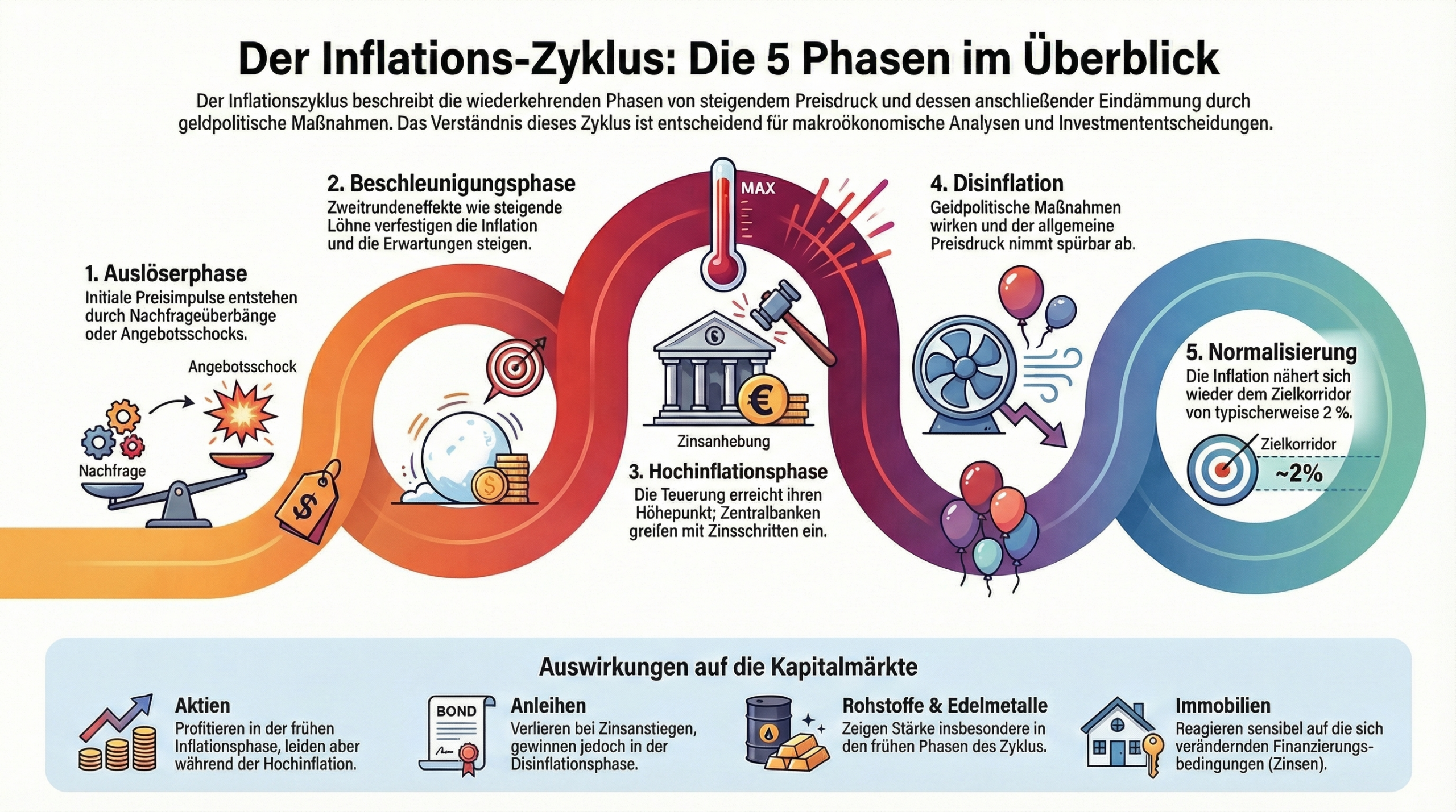 „Der Inflationszyklus beschreibt die wiederkehrenden Phasen, in denen Preisdruck entsteht, sich verstärkt, ein zyklisches Hoch erreicht und schließlich durch geld- und wirtschaftspolitische Maßnahmen wieder zurückgeführt wird.“