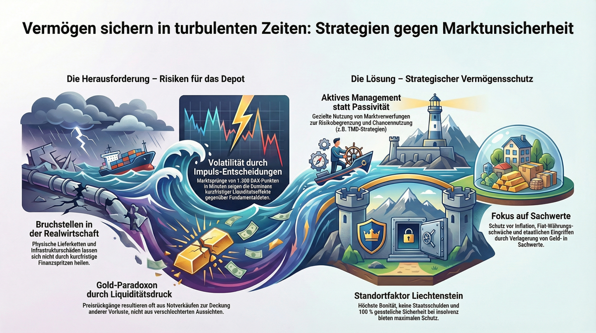 Die Entwicklungen an den Finanzmärkten sorgen aktuell für spürbare Verunsicherung. Viele Signale wirken widersprüchlich, und genau das macht eine schnelle Einordnung schwierig. Gerade in solchen Phasen zeigt sich ein wiederkehrendes Muster: Wer unter Unsicherheit vorschnell handelt, trifft Entscheidungen oft nicht auf Basis von Struktur, sondern aus einem momentanen Impuls heraus.